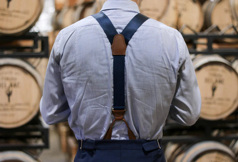Suspenders, also known as suit braces, are long strips of fabric worn over your shoulders with the purpose ofholding up your trousers. They attach to your pants with either suspender clips or suspender buttons.